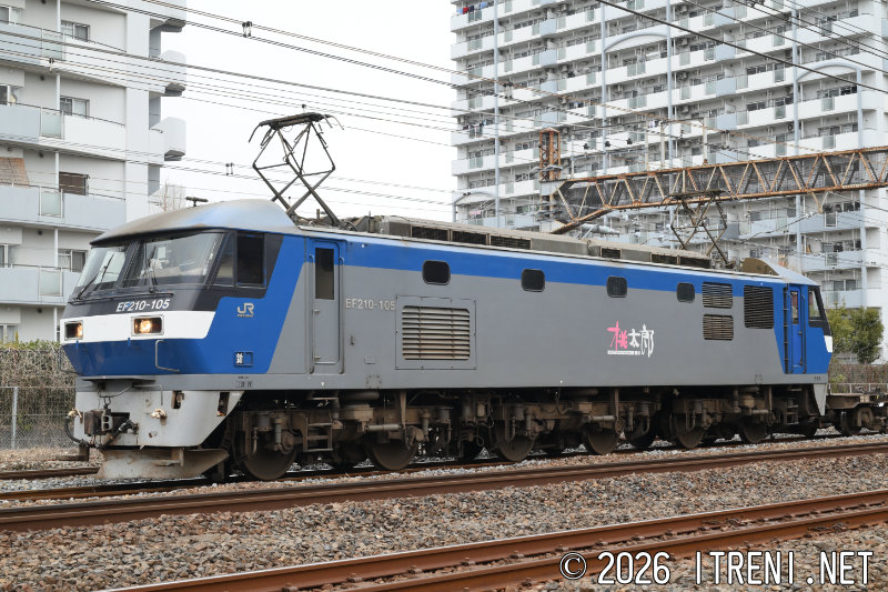 EF210-105は2017(平成29)年に全検出場した際に、JR貨物の他の機関車と同様にJRFマークが省略されたが、その後EF210形は新塗装化が進められることになったため、珍しい存在となった。